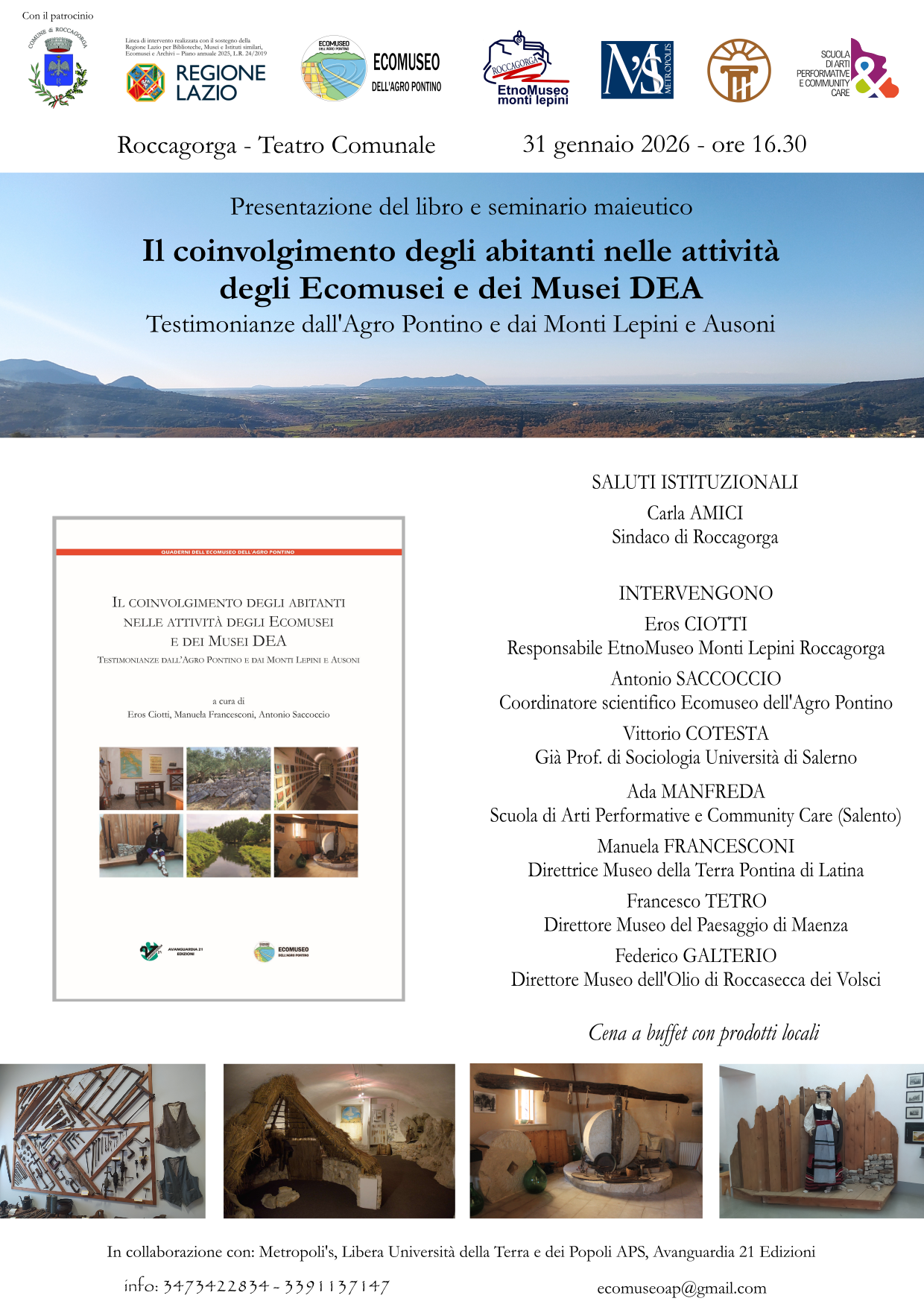 Audivisione dei filmati “I paesaggi dell’olio e dell’olivo nella Bioregione Pontina” (a cura di Ecomuseo dell’Agro Pontino, CAPOL, Università Sapienza di Roma) e “Le panare” (Scuola di Arti performative e Comunity care – Salento).