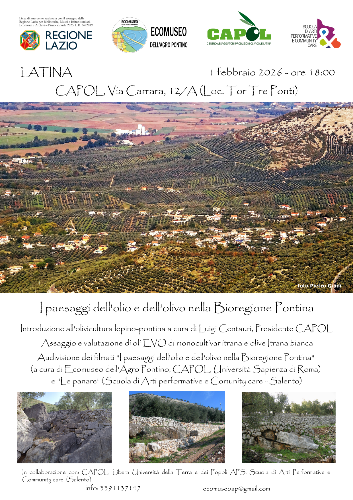 Per la serie di incontri “I paesaggi dell’olio e dell’olivo nella Bioregione Pontina”, l’Ecomuseo dell’Agro Pontino in collaborazione con la CAPOL (Centro Assaggiatori Produzioni Olivicole Latina) ha organizzato un momento di approfondimento presso la sede della CAPOL, in Via Carrara, 12/A (Loc. Tor Tre Ponti).