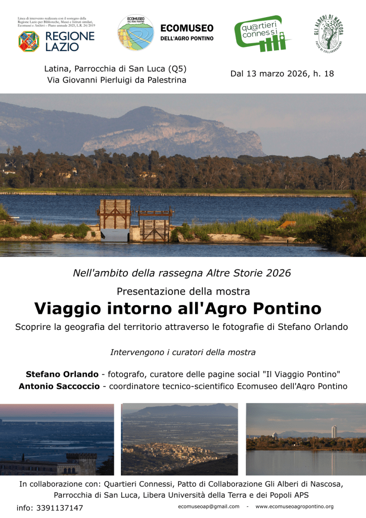 In esposizione la mostra “Viaggio intorno all’Agro Pontino. Conoscere la geografia del territorio attraverso la fotografia di Stefano Orlando”, curata dall’Ecomuseo dell’Agro Pontino.