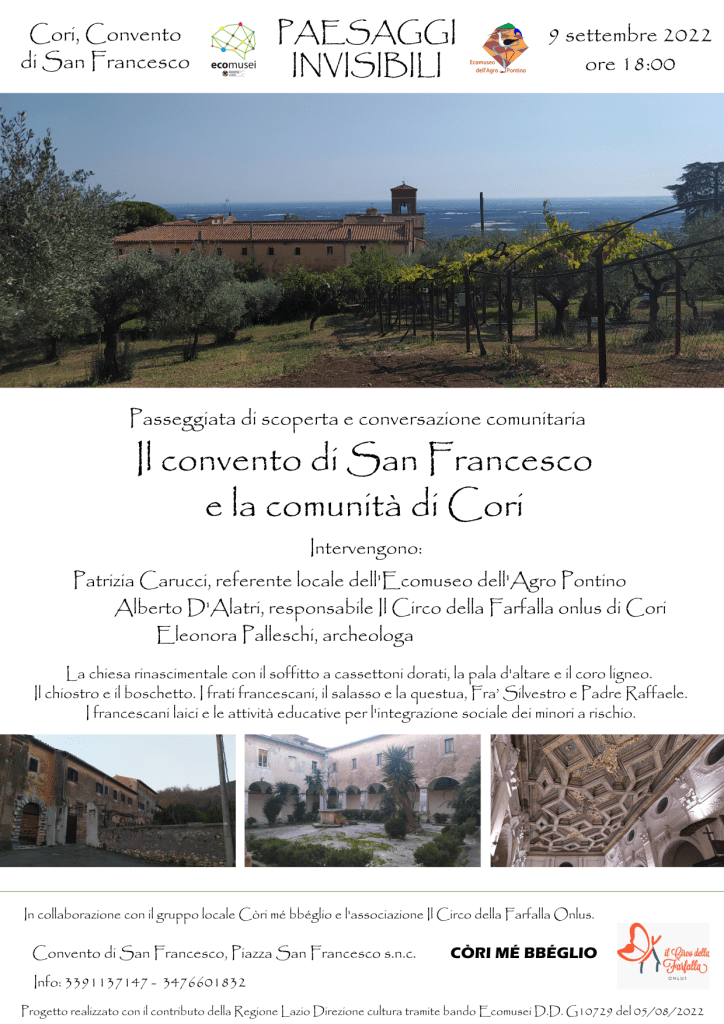 Venerdì 9 settembre 2022, dalle ore 18, presso il Convento di San Francesco di Cori si svolgerà una passeggiata di scoperta e una conversazione comunitaria nell’ambito del progetto “Paesaggi invisibili”, ideato e curato dall’Ecomuseo dell’Agro Pontino. Sarà una nuova occasione per riflettere sul patrimonio culturale, materiale e immateriale, dei Monti Lepini.