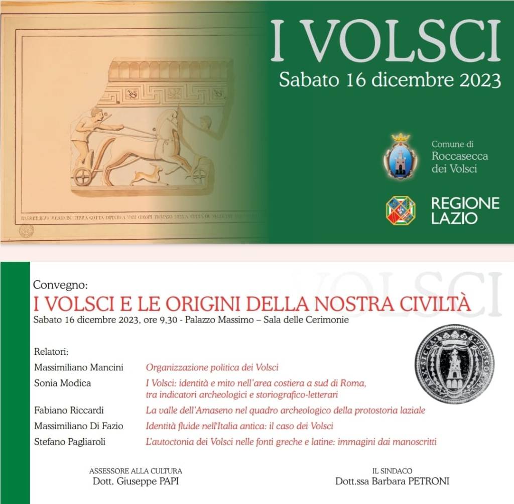 Domani, sabato 16 Dicembre 2023, a Roccasecca dei Volsci presso la Sala delle Cerimonie di Palazzo Massimo si terrà dalle ore 9.30 l’importante convegno “I Volsci e le origini della nostra civiltà”, organizzato dall’assessore alla cultura Giuseppe Papi. Relazioneranno: Massimiliano Mancini (archeologo), Sonia Modica (archeologa), Fabiano Riccardi (archeologo e referente del settore Archeologia dell’Ecomuseo dell’Agro Pontino), Massimiliano Di Fazio (archeologo), Stefano Pagliaroli (filologo).