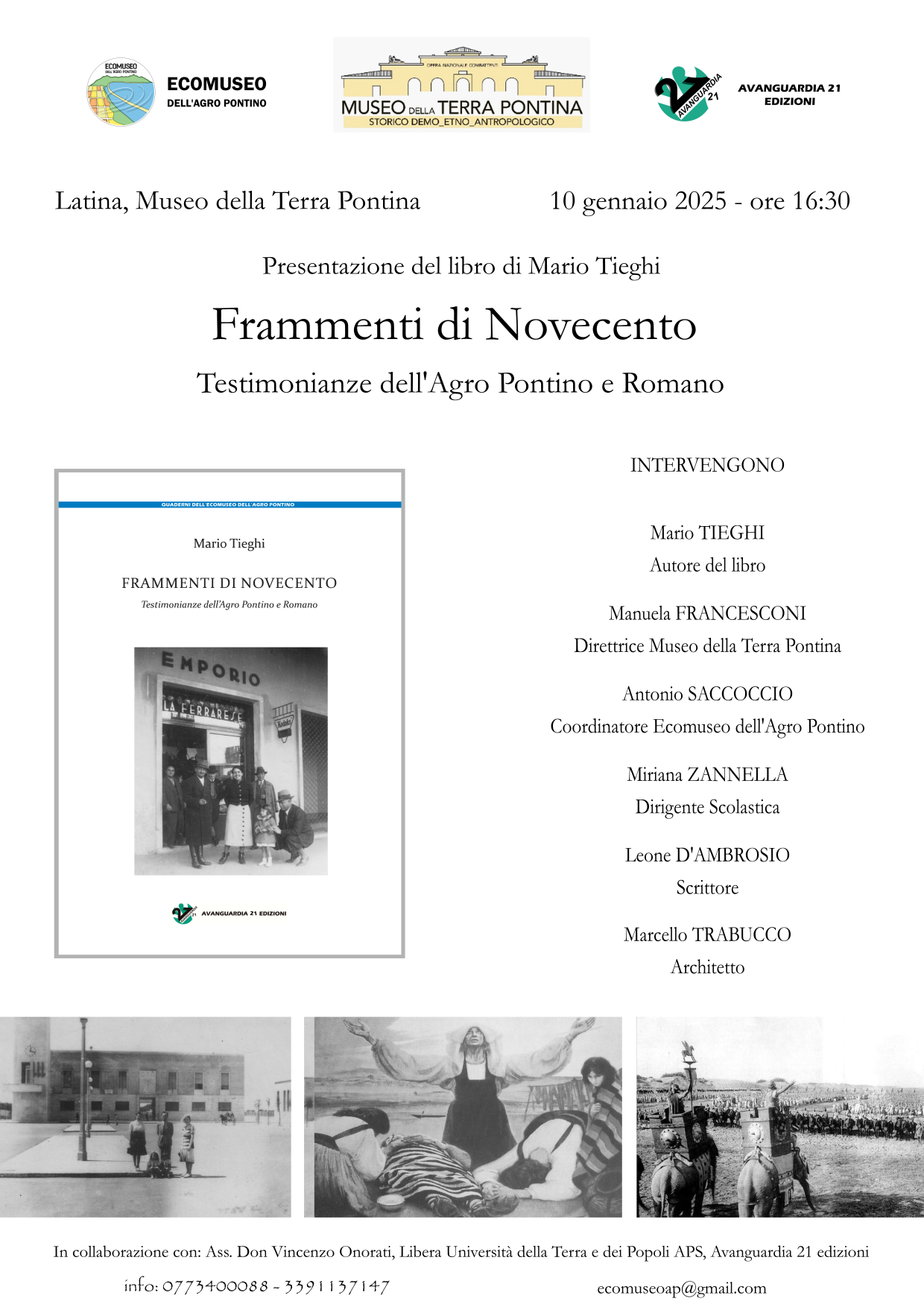 Venerdì 10 gennaio 2025 sarà presentato al Museo della Terra Pontina di Latina il nuovo libro di Mario Tieghi: “Frammenti di Novecento. Testimonianze dell’Agro Pontino e Romano”