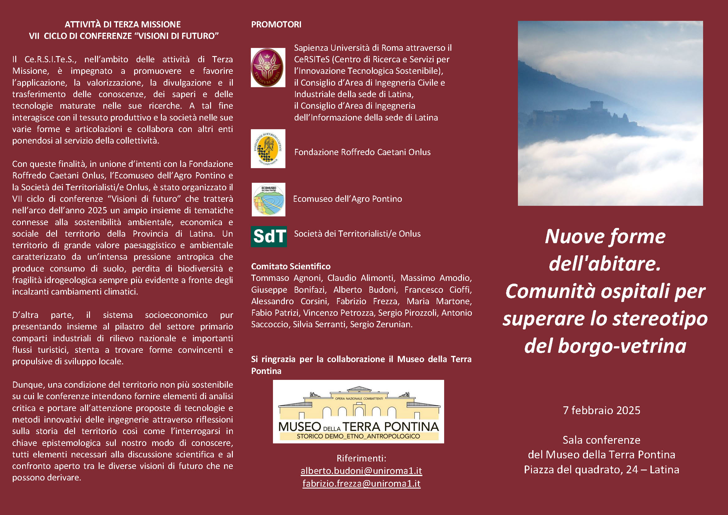Il 7 febbraio 2025 dalle ore 16.00 presso la Sala Conferenze del Museo della Terra Pontina di Latina, si svolgerà la conferenza “Nuove forme dell’abitare. Comunità ospitali per superare lo stereotipo del borgo-vetrina”, organizzata dall’Università Sapienza di Roma attraverso il CeRSITeS (Centro di Ricerca e Servizi per l’Innovazione Tecnologica Sostenibile), in unione d’intenti con la Fondazione Roffredo Caetani Onlus, l’Ecomuseo dell’Agro Pontino e la Società dei Territorialisti e con la collaborazione del Museo della Terra Pontina.