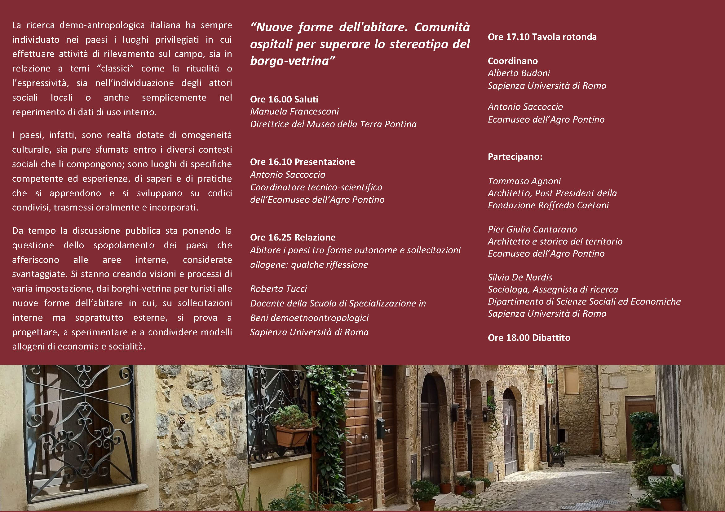 Dopo i saluti di Manuela Francesconi (Direttrice del Museo della Terra Pontina) e la presentazione di Antonio Saccoccio (Coordinatore tecnico-scientifico dell’Ecomuseo dell’Agro Pontino), ci sarà la relazione “Abitare i paesi tra forme autonome e sollecitazioni allogene: qualche riflessione” a cura di Roberta Tucci (Docente della Scuola di Specializzazione in Beni demoetnoantropologici – Sapienza Università di Roma). In seguito Alberto Budoni (Docente di Tecnica e pianificazione urbanistica, Università La Sapienza) e Antonio Saccoccio (Ecomuseo dell’Agro Pontino) coordineranno una tavola rotonda con Tommaso Agnoni (Architetto, Past President della Fondazione Roffredo Caetani), Pier Giulio Cantarano (Architetto e storico del territorio – Ecomuseo dell’Agro Pontino), Silvia De Nardis (Sociologa, Assegnista di ricerca – Dipartimento di Scienze Sociali ed Economiche, Sapienza Università di Roma). Concluderà il pomeriggio un dibattito con i presenti in sala.