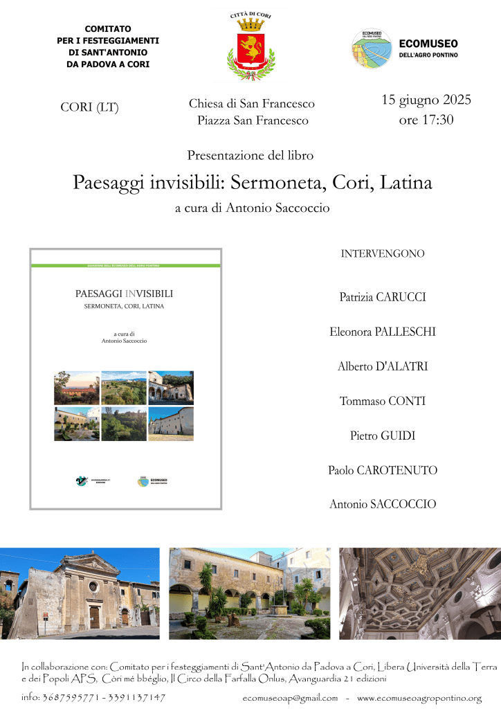 Il giorno 15 giugno 2025 a Cori, presso la Chiesa di San Francesco, sarà presentato il libro “Paesaggi invisibili. Sermoneta, Cori, Latina” , curato da Antonio Saccoccio e pubblicato all’interno dei “Quaderni dell’Ecomuseo dell’Agro Pontino” (ed. Avanguardia 21).