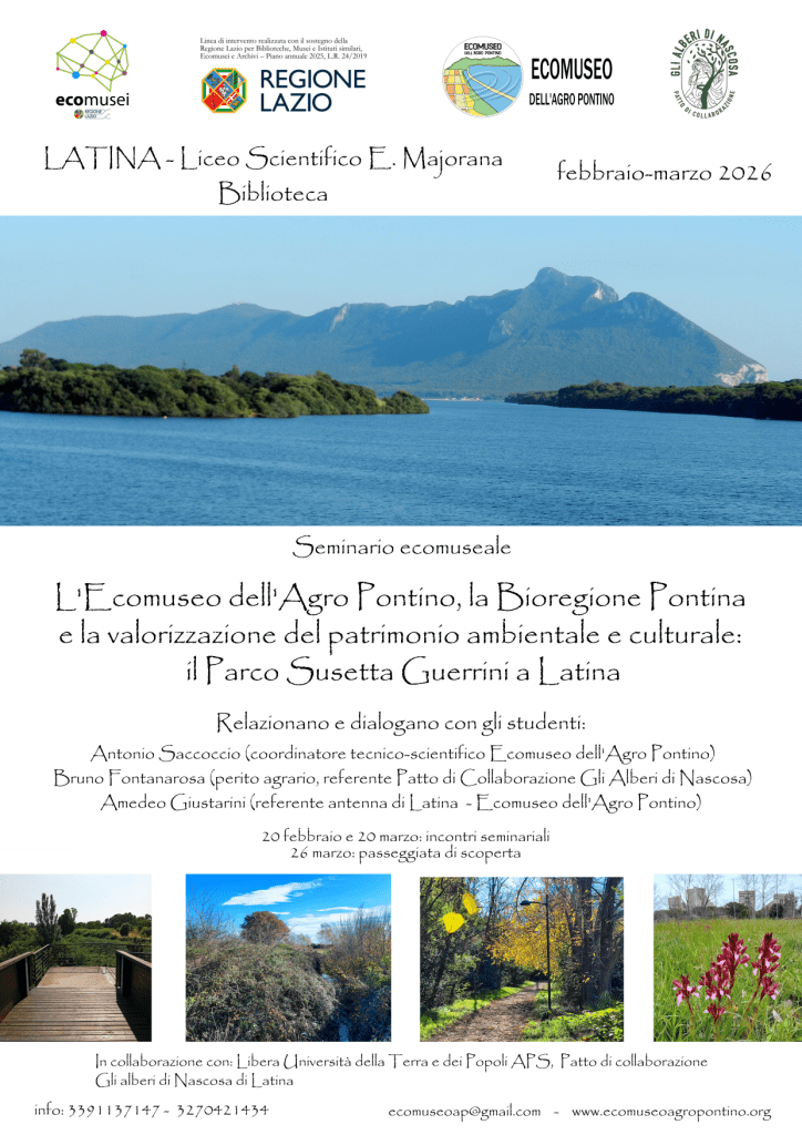 Venerdì 20 febbraio l’Ecomuseo dell’Agro Pontino sarà al Liceo Scientifico Majorana per illustrare agli studenti teoria e pratiche ecomuseali. Un focus particolare sulle azioni portate avanti dall’Ecomuseo in accordo con il Patto di collaborazione “Gli Alberi di Nascosa” di Latina. Previsti un altro incontro seminariale il 20 marzo e una passeggiata di scoperta il 26 marzo.