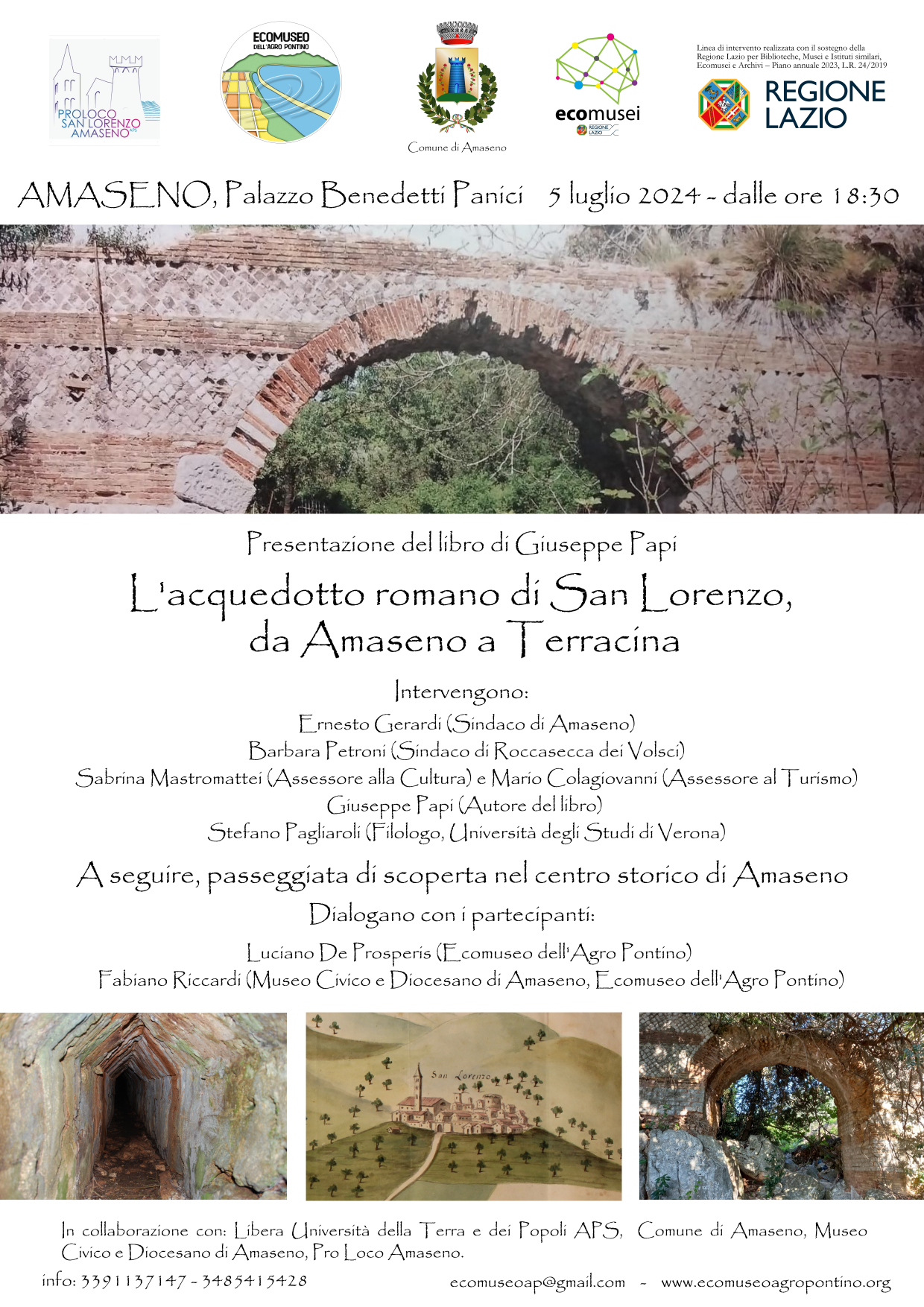 Venerdì 5 luglio 2024, alle ore 18.30, appuntamento ad Amaseno, presso il palazzo Benedetti Panici, per la presentazione del libro di Giuseppe Papi L’acquedotto romano di San Lorenzo: da Amaseno a Terracina.