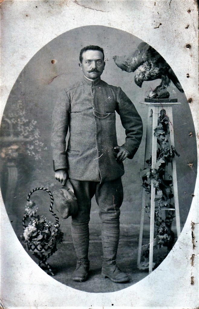 (M.P.) Il libro contiene numerose fotografie, in parte rinvenute in famiglia, altre rese disponibili da persone che, appreso delle ricerche che stavo svolgendo e della finalità, mi hanno generosamente consentito di riprodurle. Le foto riportano i nominativi di chi ha contribuito in tal modo. È stata una mia precisa volontà quella di affiancare al racconto, lì dov’era possibile, anche le pertinenti immagini affinché il lettore, osservando i ritratti ed i particolari dei volti, degli abiti, dei paesaggi raffigurati, potesse meglio partecipare al racconto di quelle vicende. In particolare i ritratti degli uomini in uniforme, inviate alle famiglie, e delle donne che a propria volta le inviavano ai propri uomini al fronte, fidanzati o mariti, “parlano” del carattere e dei sentimenti di quella Comunità. Da ogni foto si possono trarre, con un minimo di attenzione, ulteriori elementi d’informazione. Riporto ad esempio il foto-ritratto di Settimio Porcelli, uno dei fratelli di mio nonno Antonio, prigioniero di guerra degli austro-ungarici. L’immagine, emblematica, lo ritrae in una “scenografia” allestita in uno studio fotografico in cui il prigioniero di guerra Settimio, in uniforme del Regio Esercito ma priva di fregi e mostrine, è quasi sovrastato da una statua raffigurante un’aquila che, nell’araldica, simboleggia l’Austria imperiale. Un messaggio di propaganda bellica!