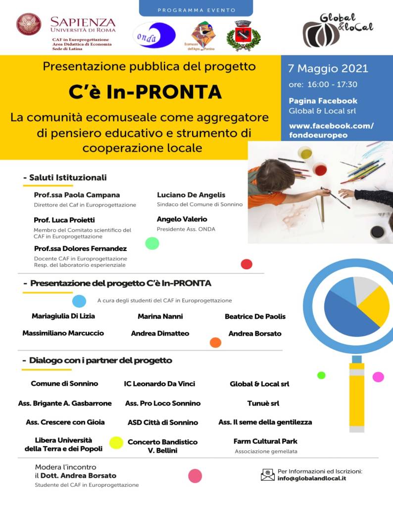 Il progetto C’è In-PRONTA sarà presentato in diretta sul canale Facebook di Global & Local il 7 maggio alle ore 16.00 con la partecipazione del Comune di Sonnino e di tutte le organizzazioni del partenariato. Interverranno il Sindaco di Sonnino, Luciano de Angelis; il Presidente dell’Associazione ONDA, Angelo Valerio; il Direttore del CAF in Europrogettazione di Sapienza Università di Roma, Prof.ssa. Paola Campana, e gli studenti che hanno partecipato al Laboratorio coordinato dalla Prof.ssa. Fernandez.