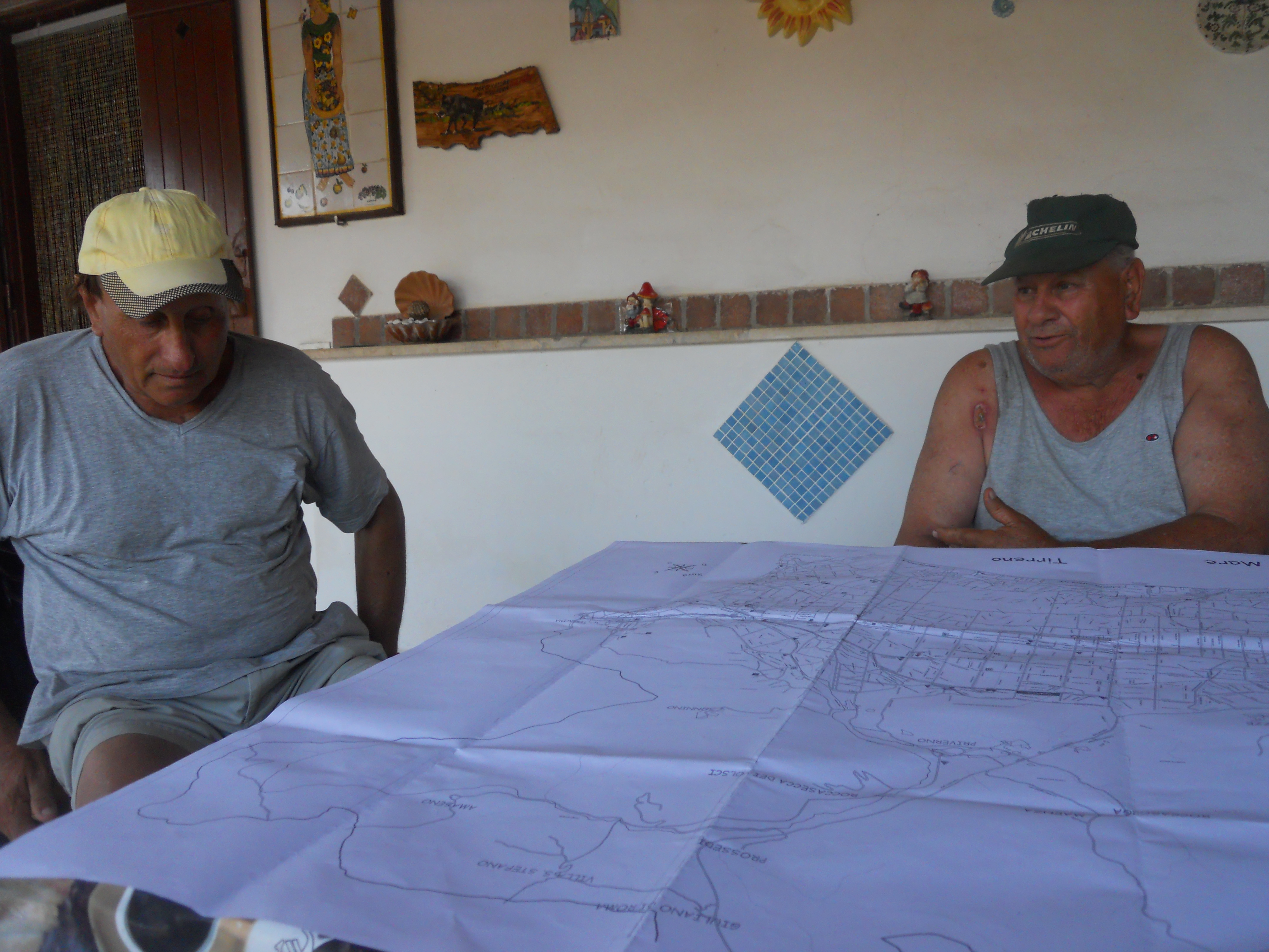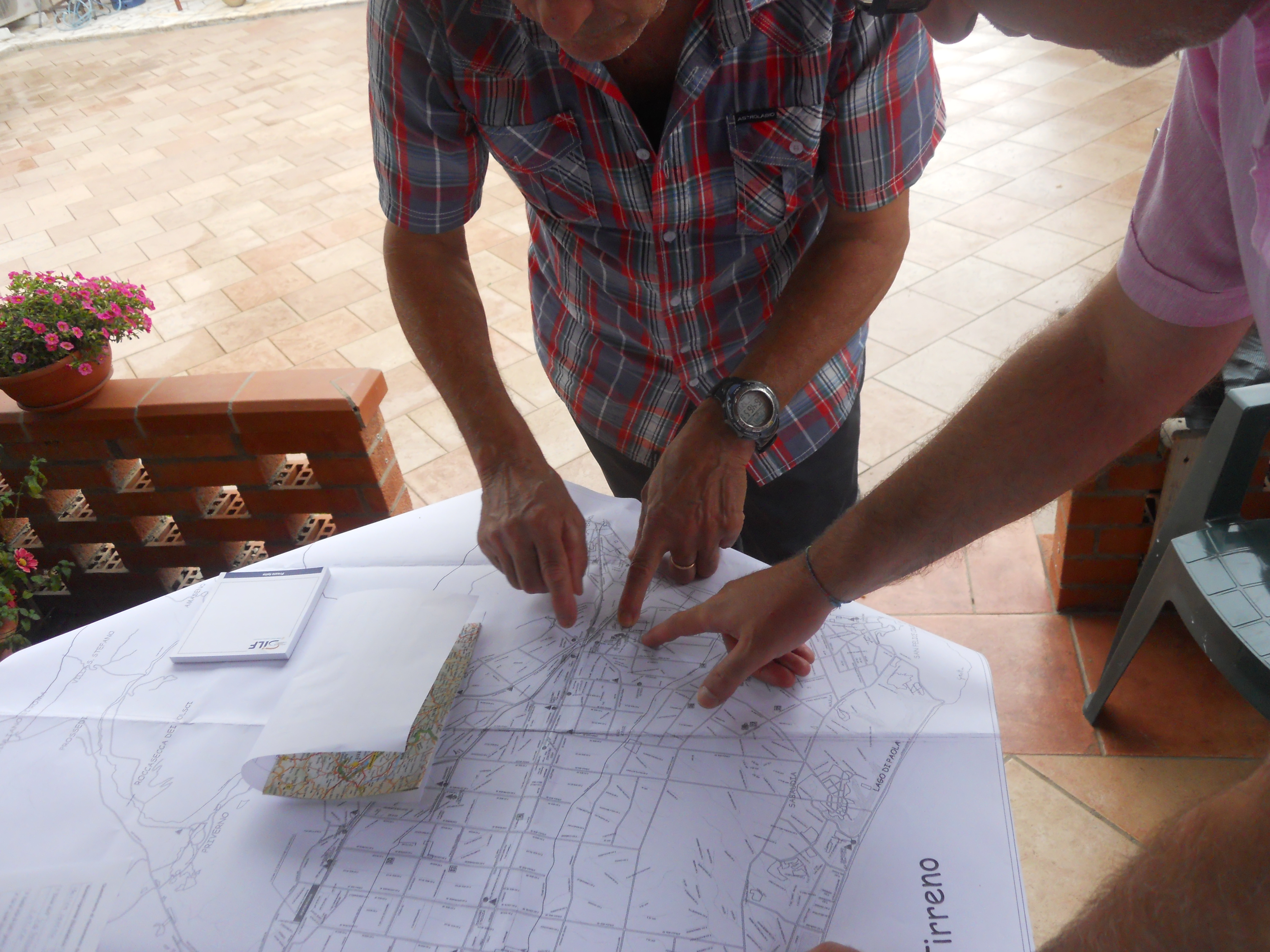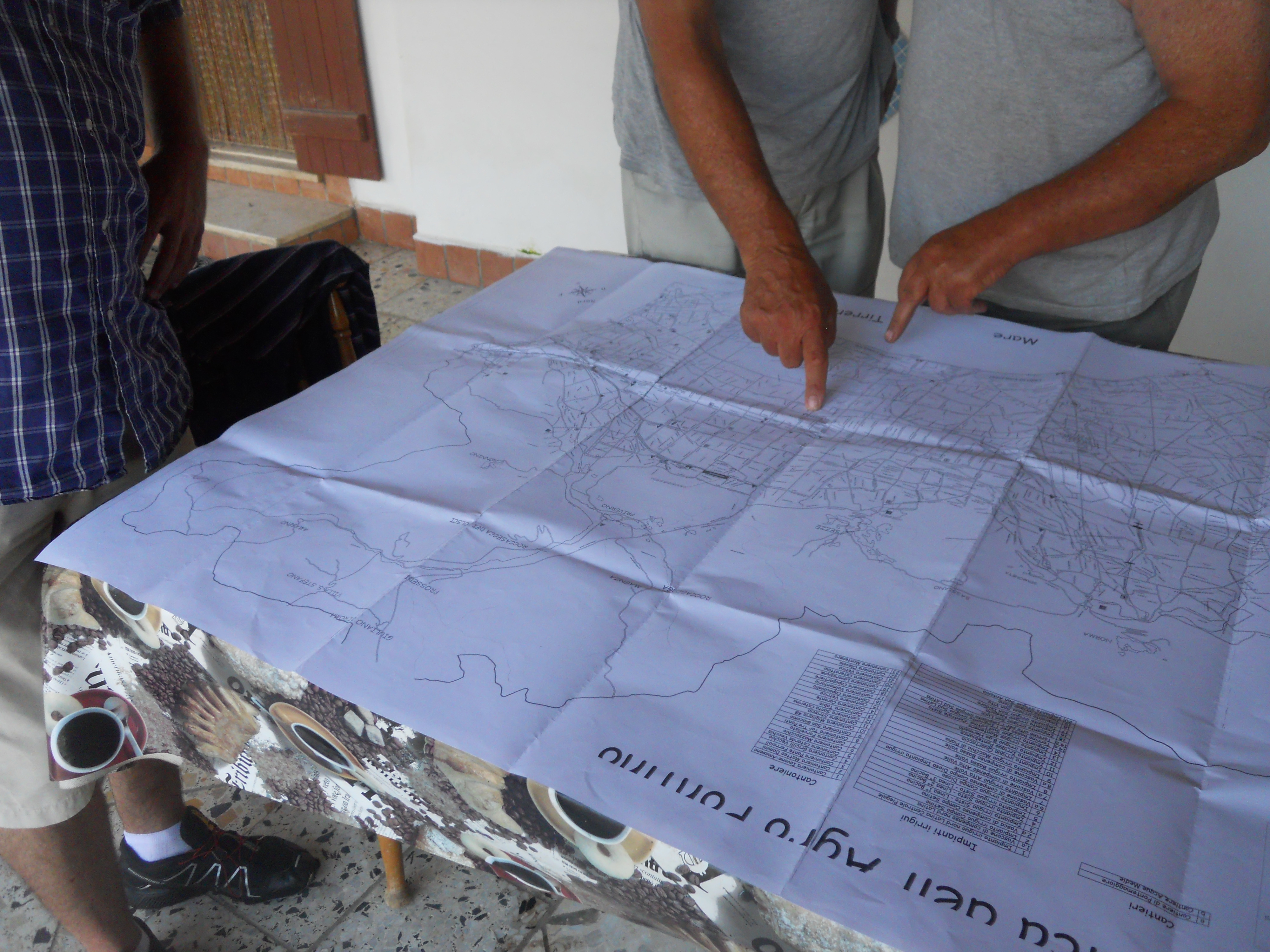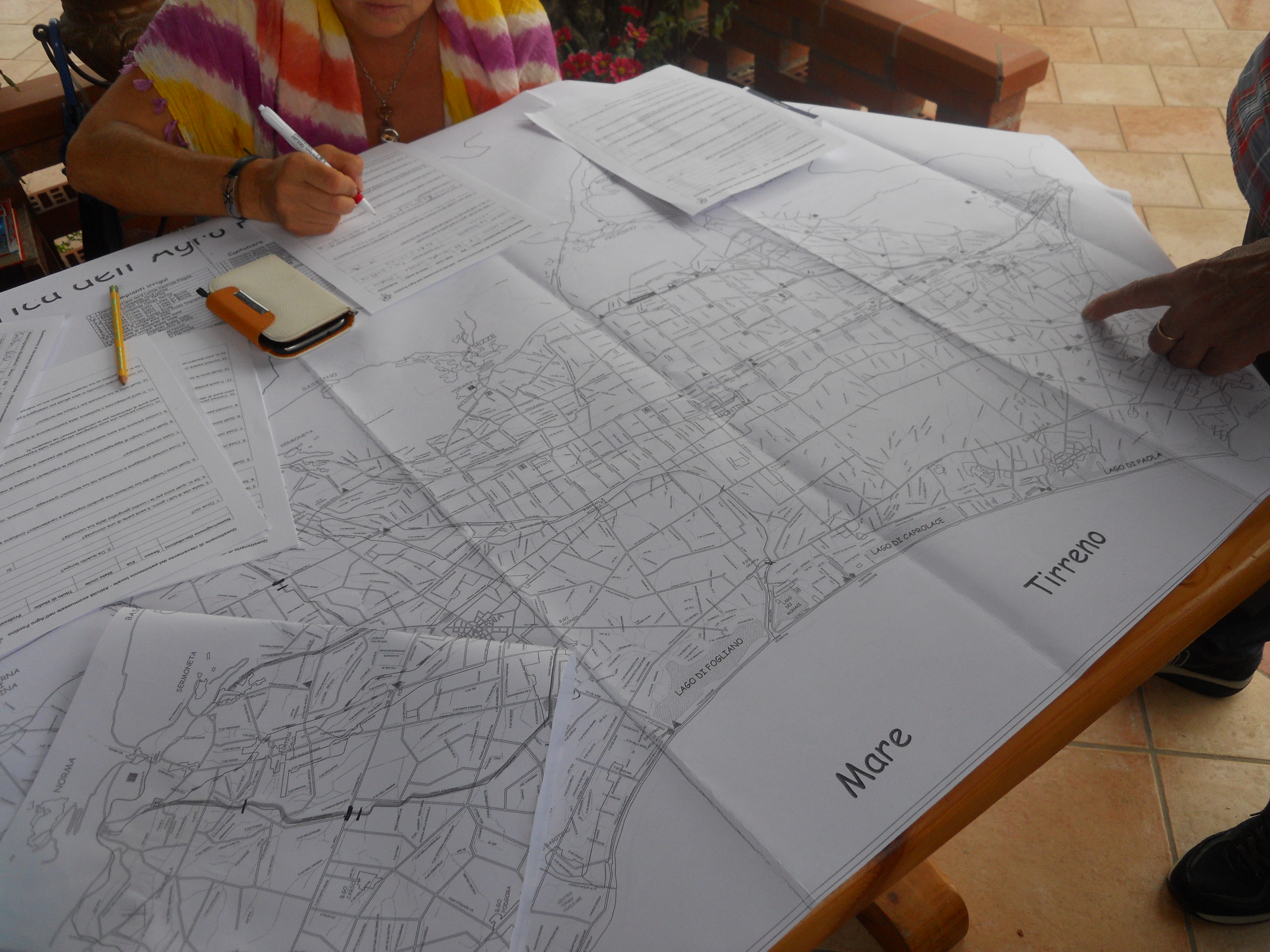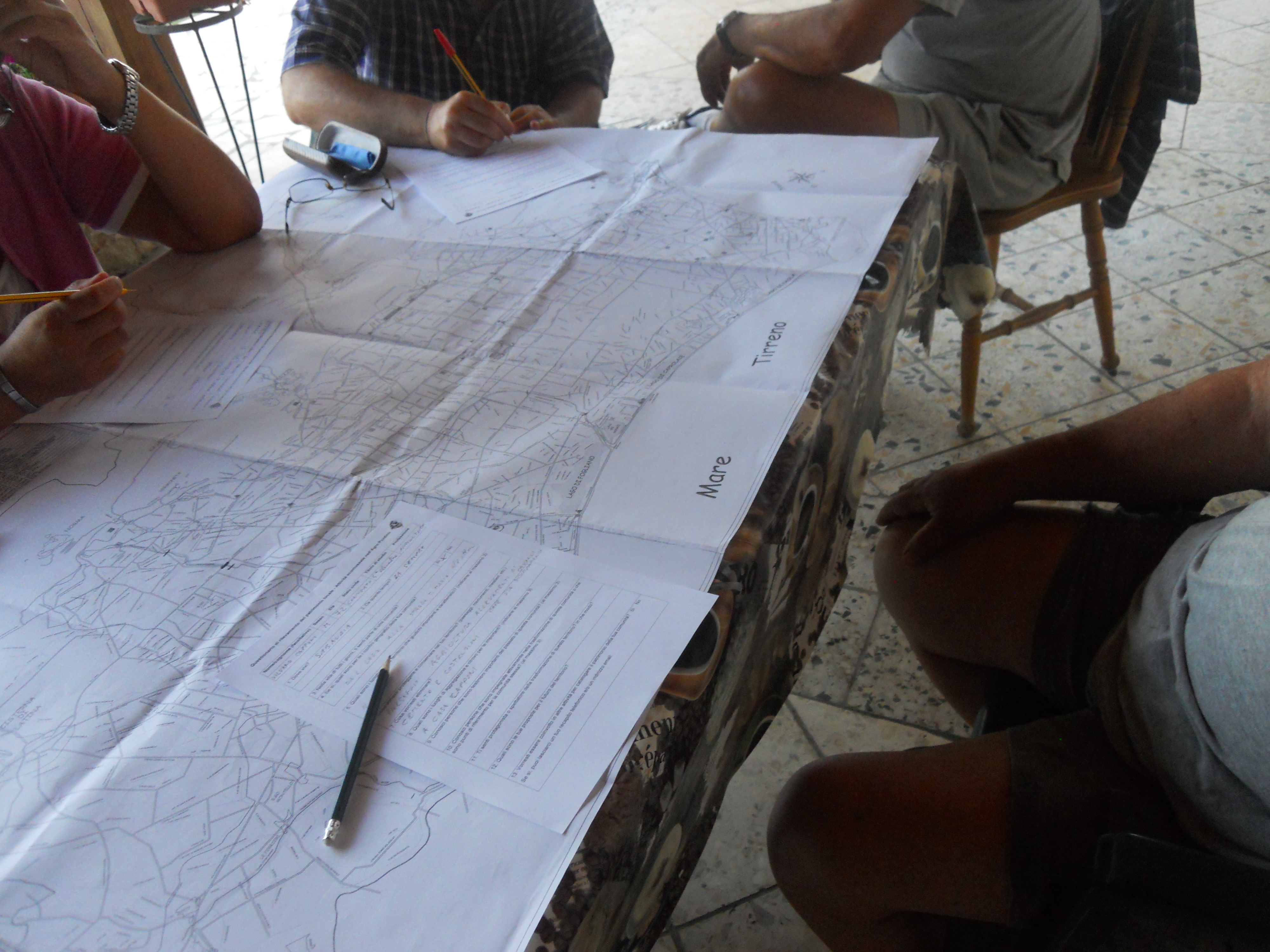 Borgo Montenero: parte della comunità, riunita in un podere per una festa di famiglia, lavora all’inventario partecipativo e annota punti rilevanti sulla carta topografica del consorzio di bonifica.