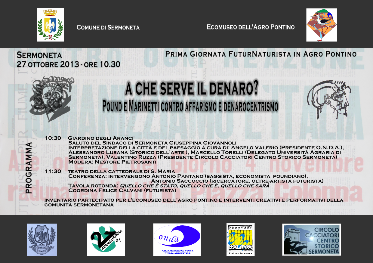 Domenica 27 ottobre 2013 alle ore 10.30 a Sermoneta (LT), presso il Giardino degli Aranci e il teatro della cattedrale di S. Maria, si terrà la conferenza intitolata A che serve il denaro? Pound e Marinetti contro affarismo e denarocentrismo. Interverranno sul tema Antonio Pantano (economista poundiano) e Antonio Saccoccio (oltre-artista futurista), che presenteranno contestualmente il loro ultimo libro pubblicato dalle edizioni Avanguardia 21 e declameranno brani di Filippo Tommaso Marinetti, Ezra Pound e Giovanni Papini. Coordina e amplifica Felice Calvani; cenni storico-economici a cura di Gian Marco Muraro. La conferenza, patrocinata dal Comune di Sermoneta, costituisce il momento centrale della “Prima Giornata FuturNaturista in Agro Pontino”, che prevede, dopo i saluti del Sindaco di Sermoneta Giuseppina Giovannoli, un’interpretazione del paesaggio in chiave dinamico-evolutiva curata da Angelo Valerio (presidente O.N.D.A) e interventi di Alessandro Lusana (storico dell’arte), Marcello Torelli (delegato Università Agraria di Sermoneta), Valentino Ruzza (presidente Circolo Cacciatori Centro Storico Sermoneta). Coordina Nestore Pietrosanti. Nel corso della giornata la comunità sermonetana sarà impegnata nell’inventario partecipato per l’Ecomuseo dell’Agro Pontino e proporrà propri interventi creativi e performativi.