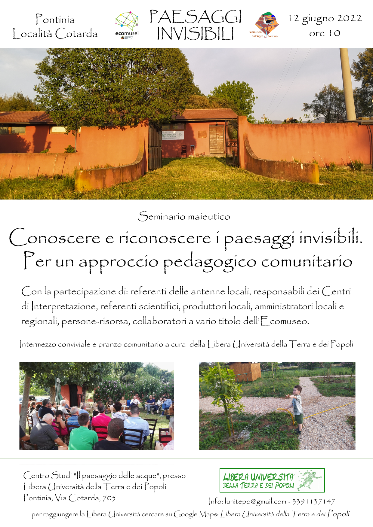 Domenica 12 giugno 2022 a Pontinia, presso la sede della Libera Università della Terra e dei Popoli, centro studi dell’Ecomuseo: seminario maieutico “Conoscere e riconoscere i paesaggi invisibili. Per un approccio pedagogico comunitario”, primo incontro del progetto “Paesaggi invisibili”.