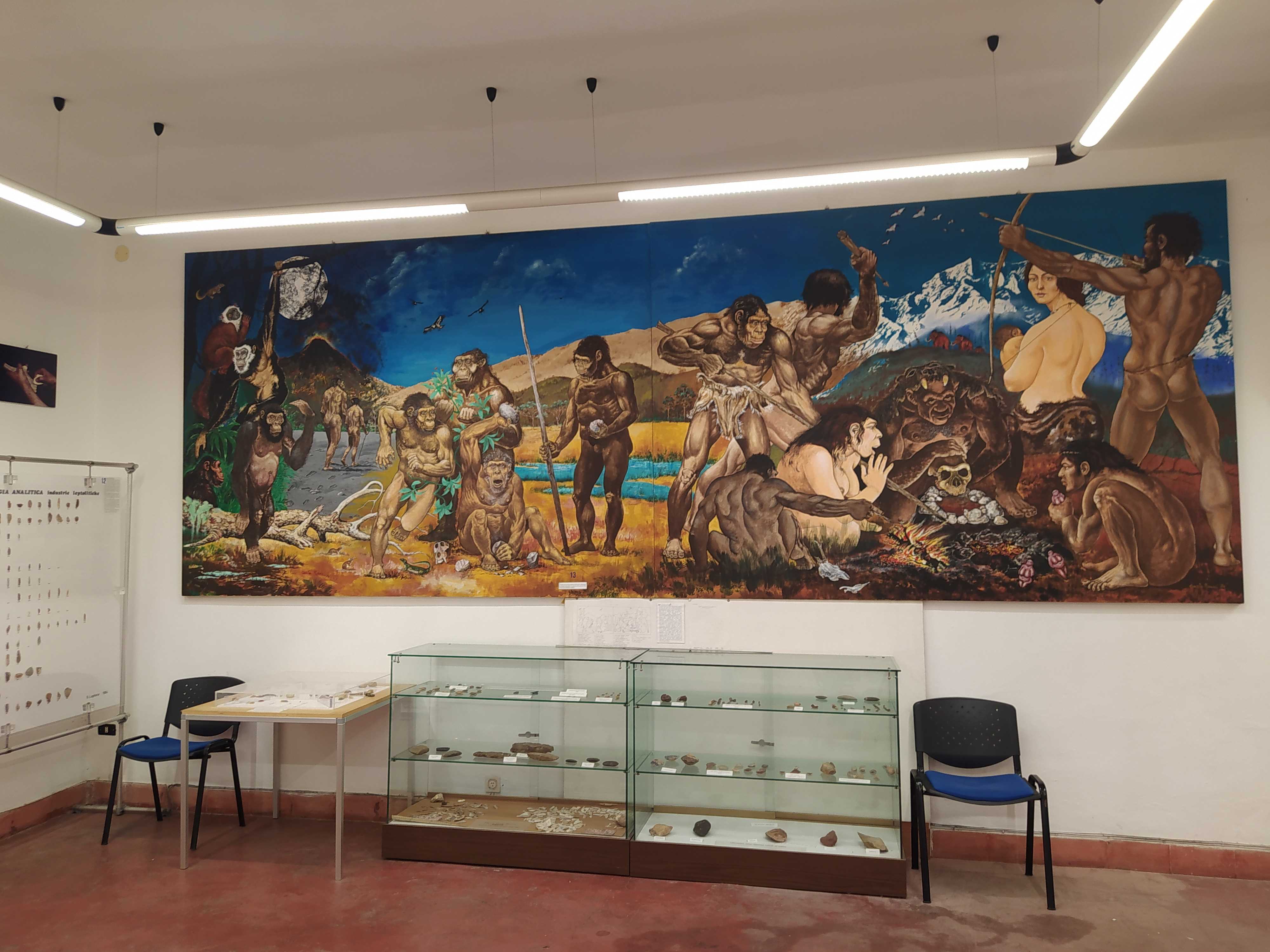 La prima sala del Museo, con l’affresco di 6 metri che compendia 70 milioni di anni, dai piccoli mammiferi all’Homo Sapiens